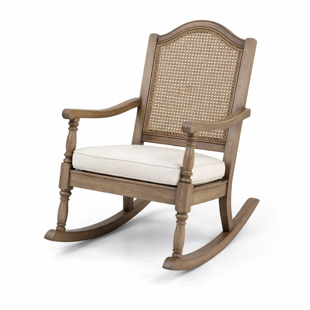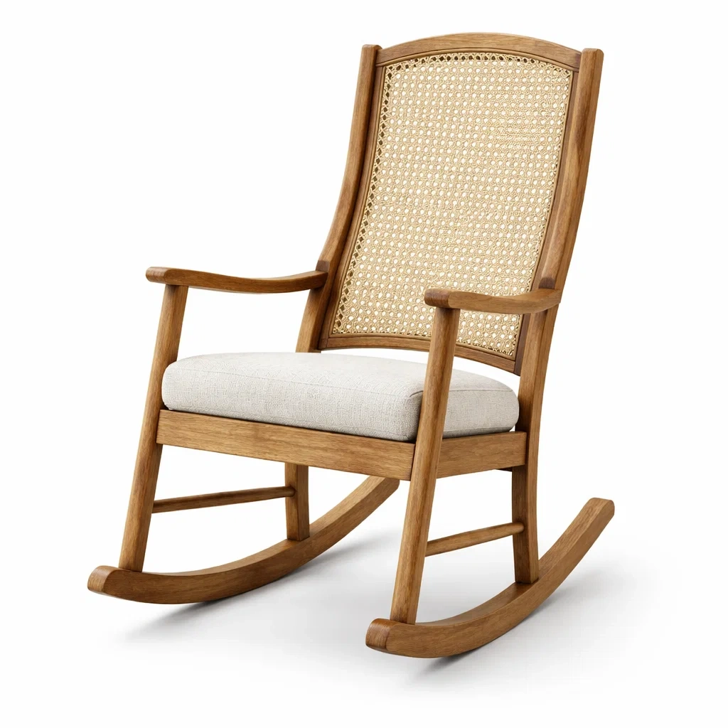 Fauteuil à bascule en bois avec dossier en rotin et coussin en lin beige