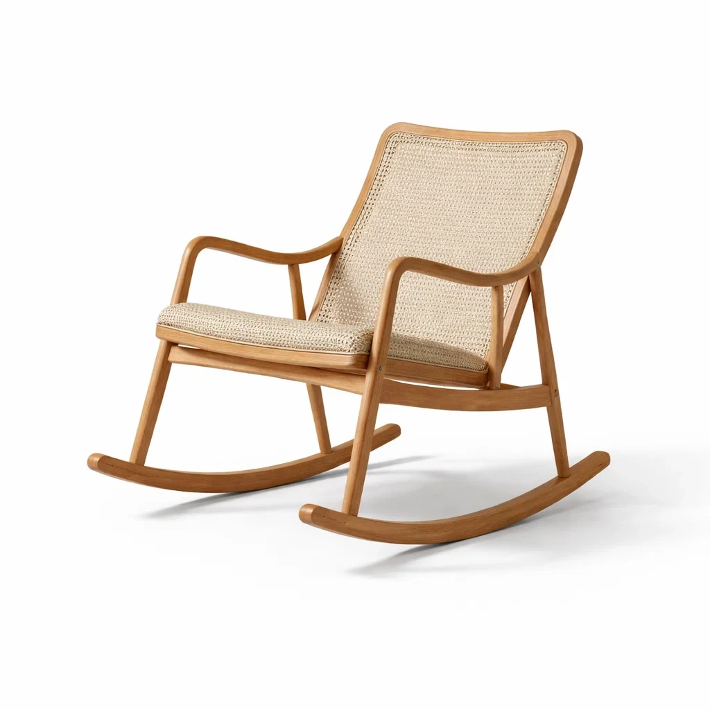 Fauteuil à bascule en bois de teck et cannage avec coussin blanc
