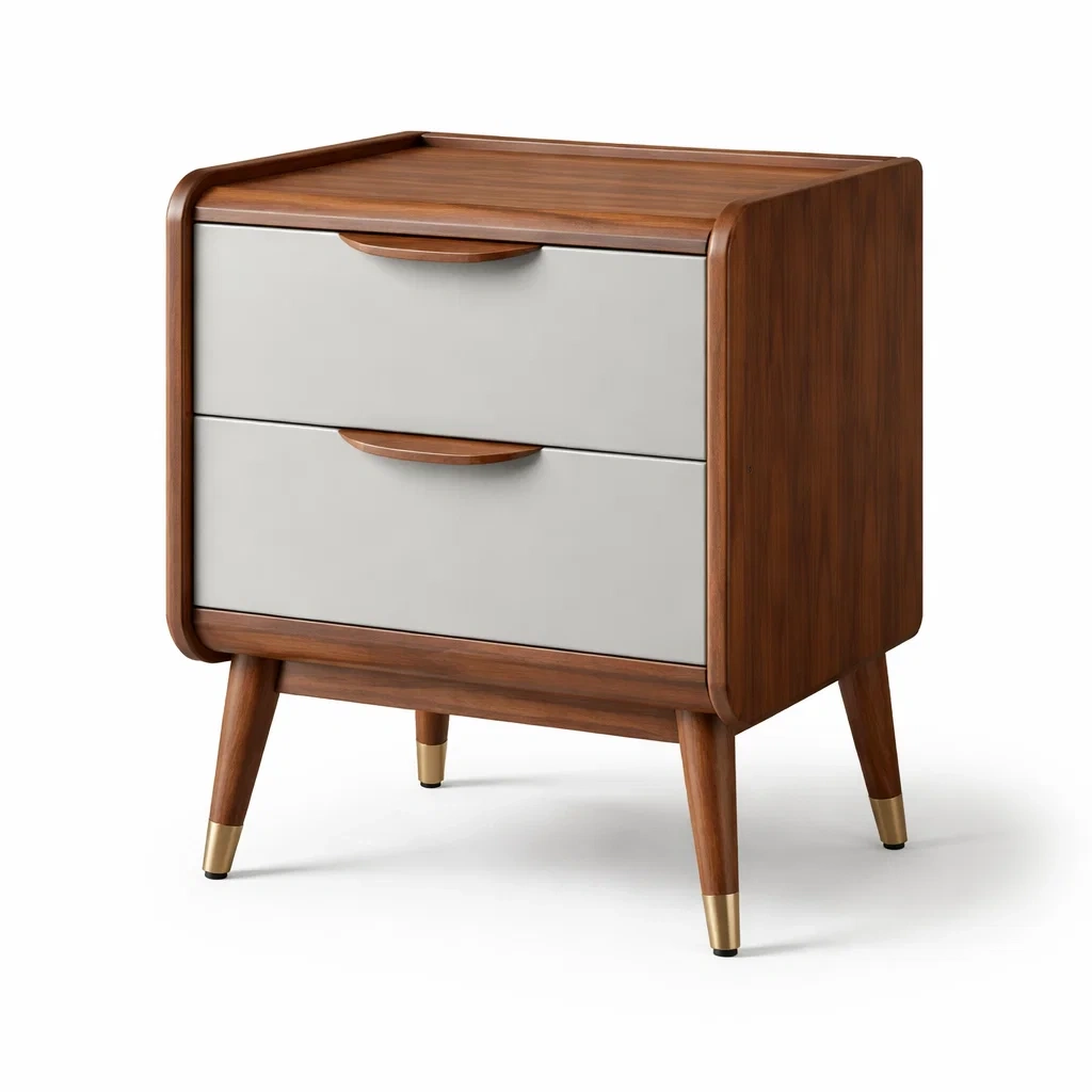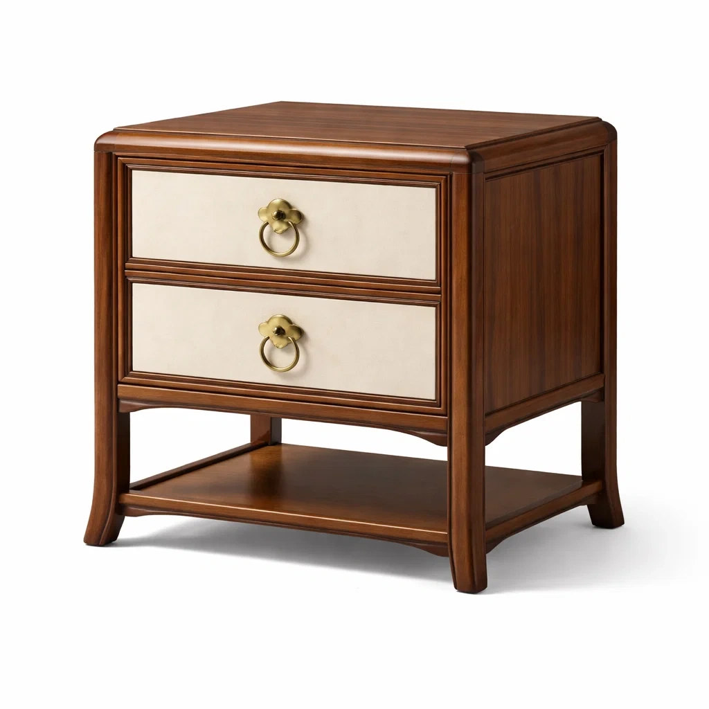 Bois Table de chevet avec Tiroirs en Cuir Beige