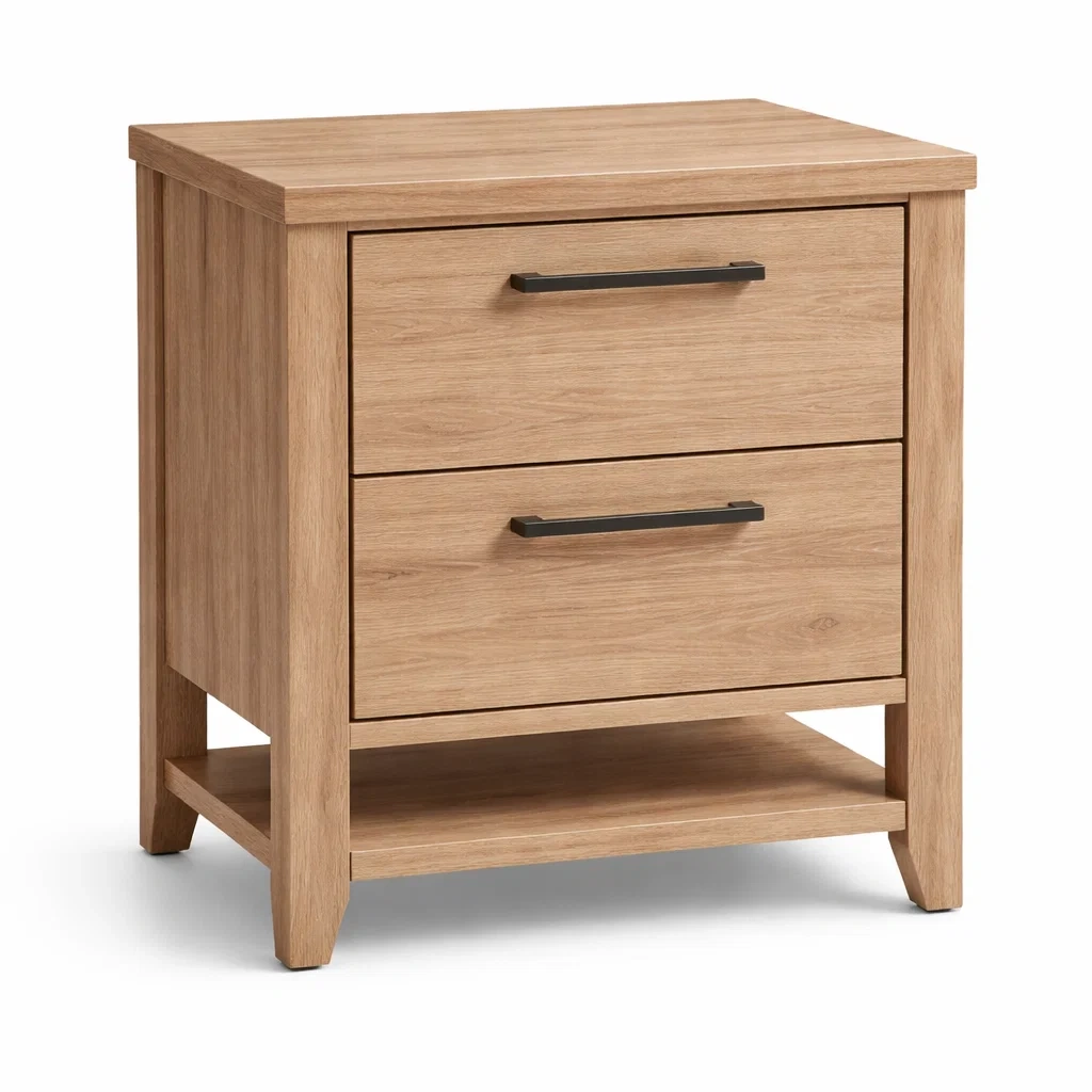 Table de chevet en bois dotée de deux tiroirs et d'une étagère inférieure. Fabriquée en panneau de particules avec finition chêne.