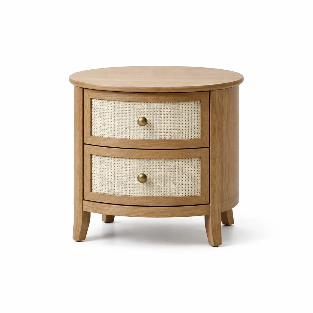 Cette table de chevet est fabriquée en bois de chêne clair avec des façades de tiroir en rotin tissé. Elle dispose de deux tiroirs offrant des rangements pratiques.