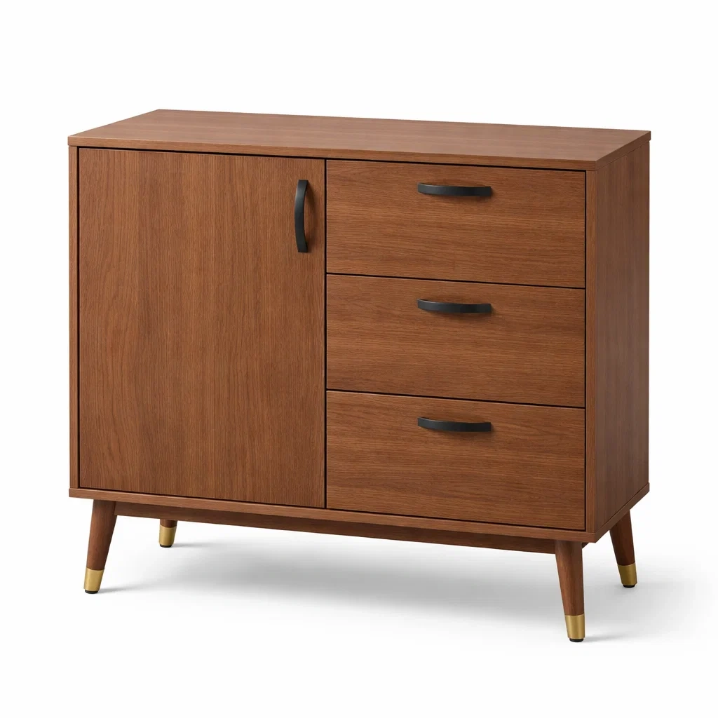 - Matériau : Bois plaqué noyer, poignées en métal noir.