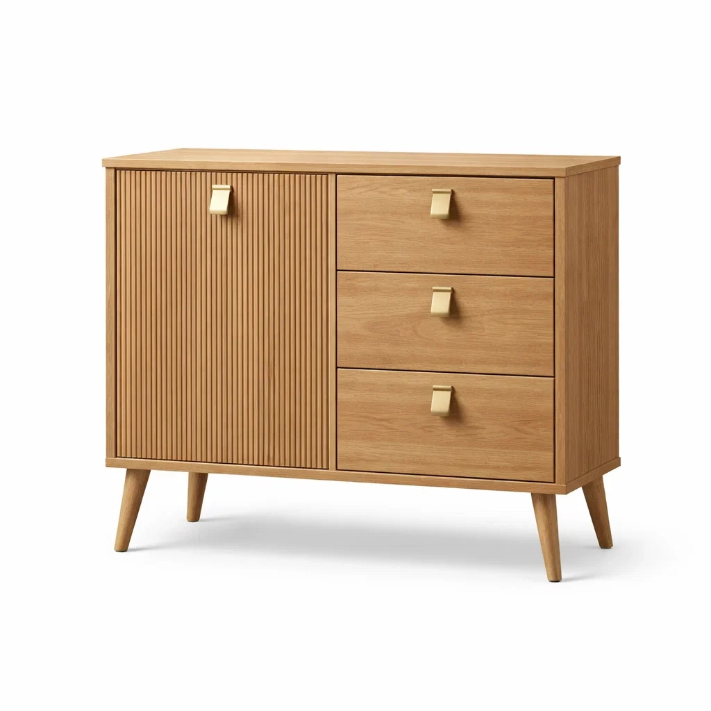 Cette commode est fabriquée en bois de chêne et dispose de poignées en métal doré. Elle mesure 90 cm de long, 40 cm de large et 80 cm de haut. La couleur principale est le chêne. Cette unité inclut trois tiroirs et une porte. La finition de surface est en vernis clair. Nettoyage avec un chiffon humide recommandé.