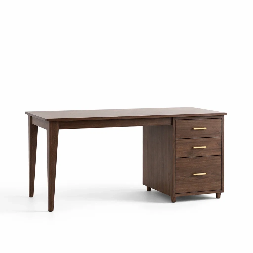 Le bureau est fabriqué en bois d'ingénierie avec une finition en placage de noyer et comporte trois tiroirs sur le côté droit pour un rangement pratique.