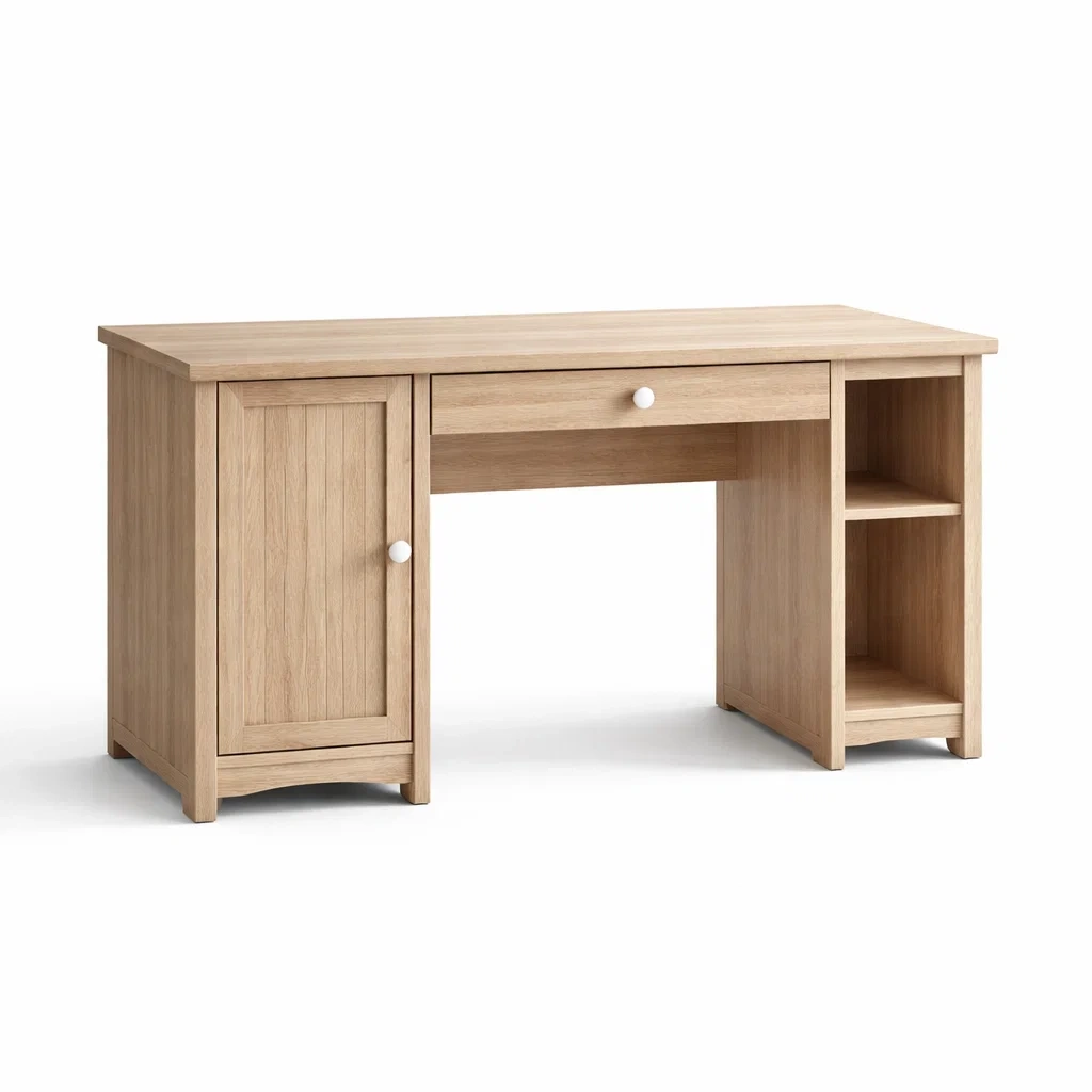 Ce bureau est fabriqué en panneaux de particules avec une finition chêne. Ses dimensions sont de 120 cm x 40 cm x 75 cm, offrant un espace de travail adéquat. Il dispose d'un tiroir, d'une porte et de deux étagères pour un rangement pratique. La surface est résistante aux rayures et le poids total est de 20 kg.