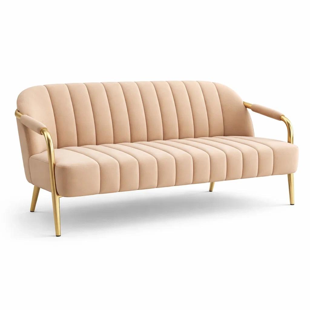 Ce canapé 3 places est doté d'un revêtement en velours beige. La structure et les pieds sont en métal doré. Dimensions : 200 cm de long, 85 cm de large et 75 cm de haut. Poids total : 30 kg. Le canapé nécessite un assemblage simple.