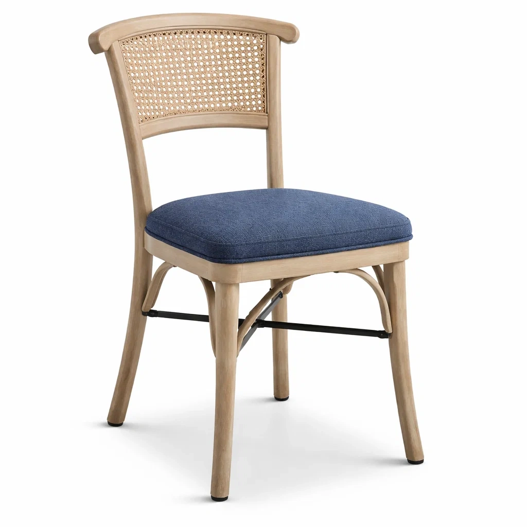 Matériau : Bois massif, assise en tissu polyester, dossier en rotin naturel