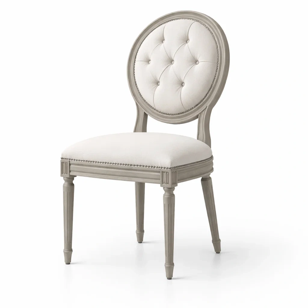 Cadre en bois avec une finition grise, siège recouvert de tissu en polyester beige. Rembourrage en mousse haute densité pour un confort optimal. Boutons capitonnés et pieds tournés ajoutent des détails élégants.