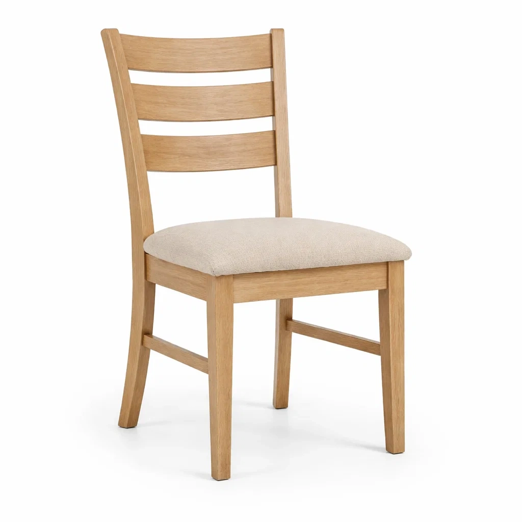 Chaise en bois de chêne clair avec une assise rembourrée en tissu polyester beige.