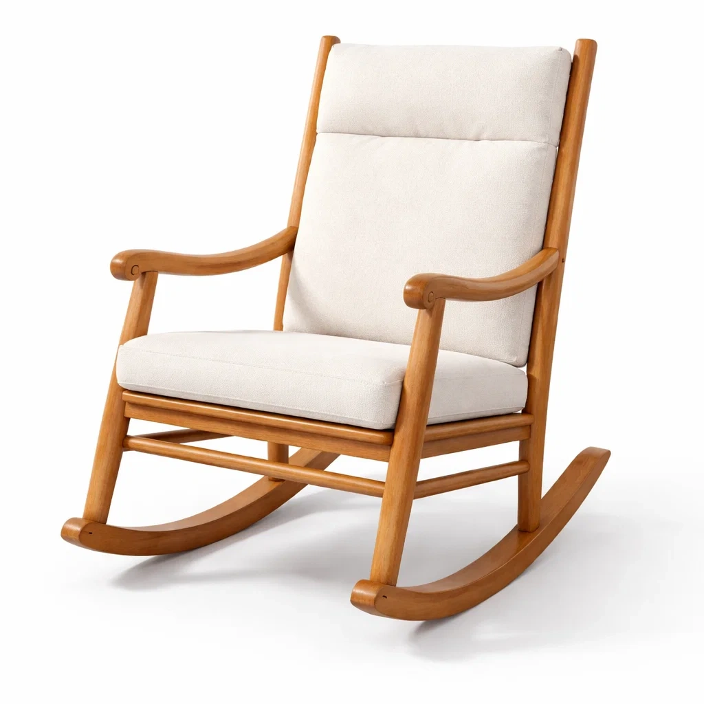 La chaise berçante est fabriquée en bois massif et est équipée d'un coussin en tissu polyester beige. Le cadre en bois robuste assure une grande stabilité.