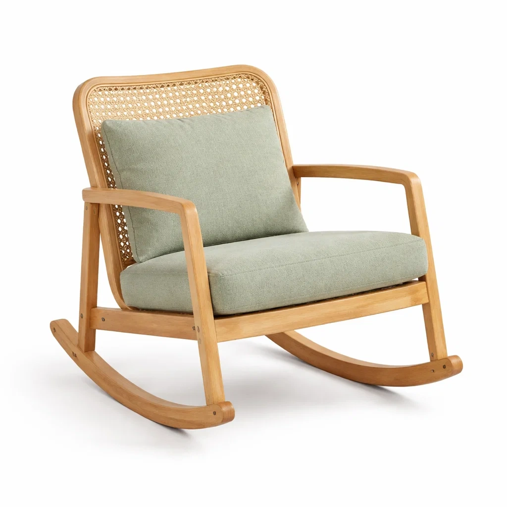 Ce fauteuil à bascule est conçu avec une structure en bois massif et un dossier en rotin.